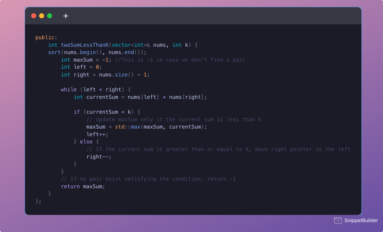 If the sum is less than 'k', update the maximum sum and move the 'left' pointer to the right to explore larger sums.